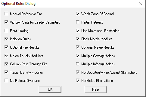Attached are the optional rules I generally prefer.  The combo of un-checking no retreat overruns and partial retreats, and checking no melee eliminations, is to prevent whole stack eliminations (too gamey IMO).