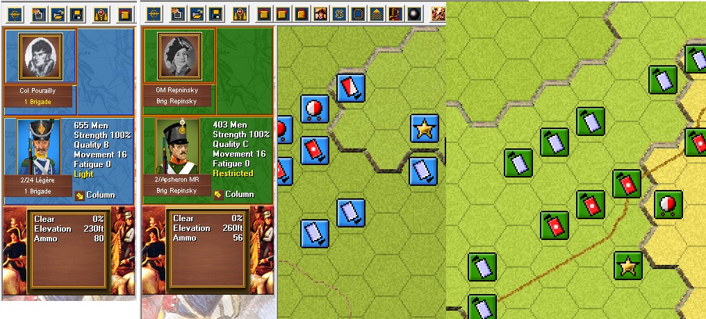 This time around I put in a bid for the old B&W leader images to be replaced with color versions. Joe Amoral is taking about 60 B&W leader images and making a color picture for each. I was really impressed with his image for GB Boudet of the French army. I started adding in color images back in the Austerlitz game (or it might have been Leipzig). I am happy to say that this next game will have a nice variety of unit images. Whereas Marengo about about 60 images this game has over 240! I went overboard this time around but I know its going to be worth it. I am enjoying playtesting the battles and learning to pick out the individual hussar regiments by their colors .. instead of having ONE hussar image per Nation.
